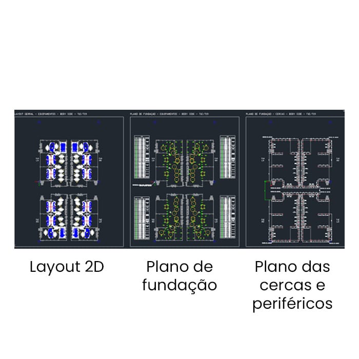 Já o layout 2d complementa as informações e acrescenta o plano de fundação e logística.